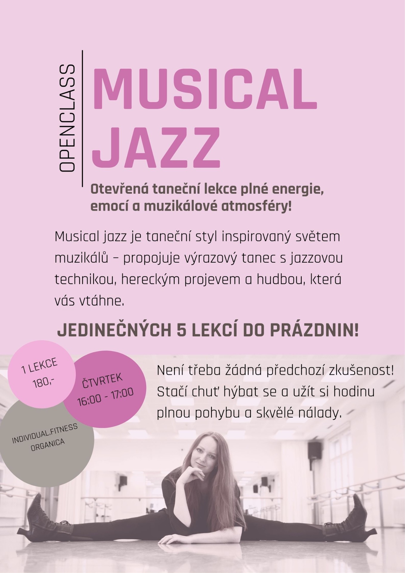 Chceš si zatančit jako na jevišti Broadway? Přijď si vyzkoušet musical jazz na otevřenou lekci plnou energie, výrazového pohybu a muzikálové atmosféry!